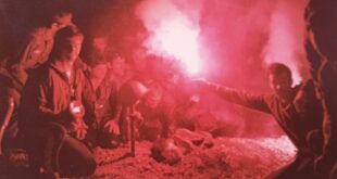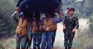 Η φωτογραφία είναι από την διαβολοβδομάδα του 101 σχλ το 1988. Βλέπουμε τον Βολιώτη, Κ/Δ Μπίσδρα Γιάννη. Εχουν επιστρέψει στην ΜΥΚ από την βαρκοπορεία, μπορείτε να διακρίνετε την βαρκα στο κεφάλι του. Ειναι κατάκοπος και λαχανιασμένος κι εκεί που σκέφτεσαι «επιτέλους φτάσαμε. Τελείωσε» ανοίγει την μάνικα ο εκπαιδευτής και σου …